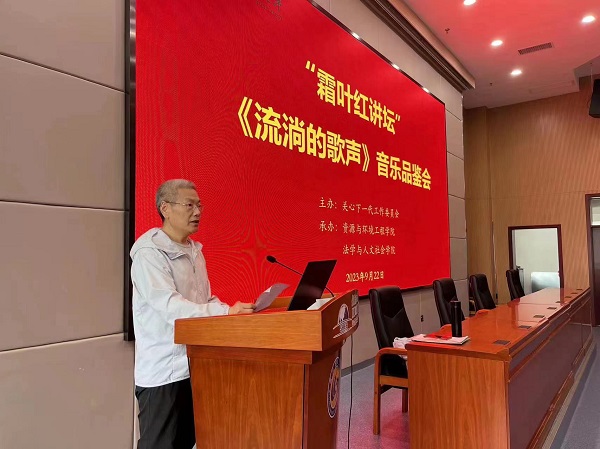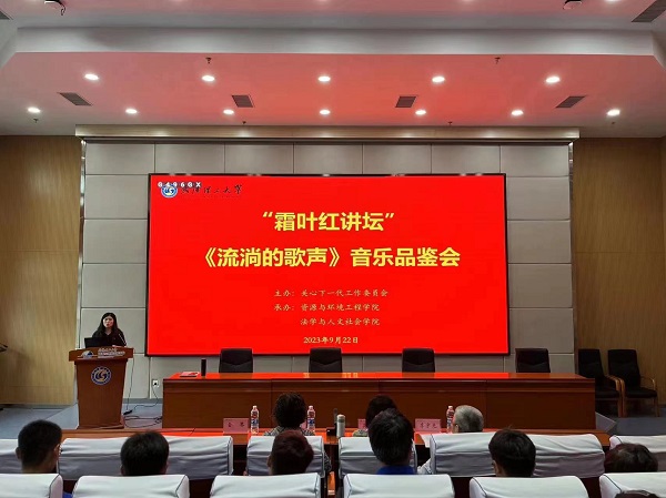 “霜叶红讲坛”之《流淌的歌声》音乐品鉴会顺利举办2023-10-07 14:30:00 来源:离退休工作处西院办公室9月22日下午,由学校关心下一代工作委员会主办,资源与环境工程学院、法学与人文社会学院等单位承办的“霜叶红讲坛”之《流淌的歌声》音乐品鉴会在资环学院北楼报 告厅举行。校离退休工作部正处级组织员李宇光,校关工委专职副秘书长吴哲敏,校“霜叶红”讲坛特邀讲师、校原艺术中心退休教师董丽丽出席讲座。资环学院、法学社会学院、 材料学院、理学院、经济学院、艺设学院等师生代表参与。讲座由资环学院党委副书记金琴主持。