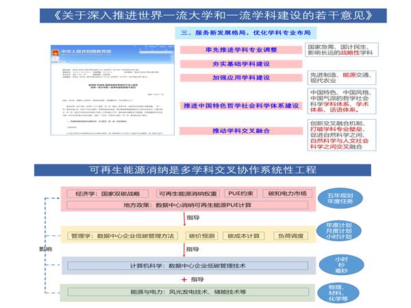 陈教授还结合学术讲座讨论了2022年1月发布的《关于深入推进世界一流大学和一流学科建设的若干意见》中“服务新发展格局,优化学科专业布局”的重要意义,指出可再生能源消纳是多学科交叉协作的系统性工程,需要经济学、管理学、计算机科学、能源与电力科学等多学科参与建设。目前碳计量标准等话语体系还掌握在西方国家手中,理工科必须加强与人文社科交叉,才能在产业领域提出自己的新观点、构建新理论,将技术转化为话语体系,这方面学科交叉推进中国特色哲学社会科学体系建设十分重要。