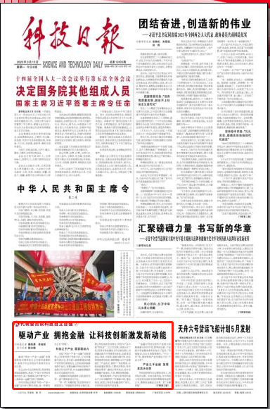 新闻网讯 3月13日,《科技日报》头版“代表委员谈科技自立自强”专栏以《驱动产业 拥抱金融 让科技创新激发新动能》为题,对全国人大代表孙涛垒进行报道。