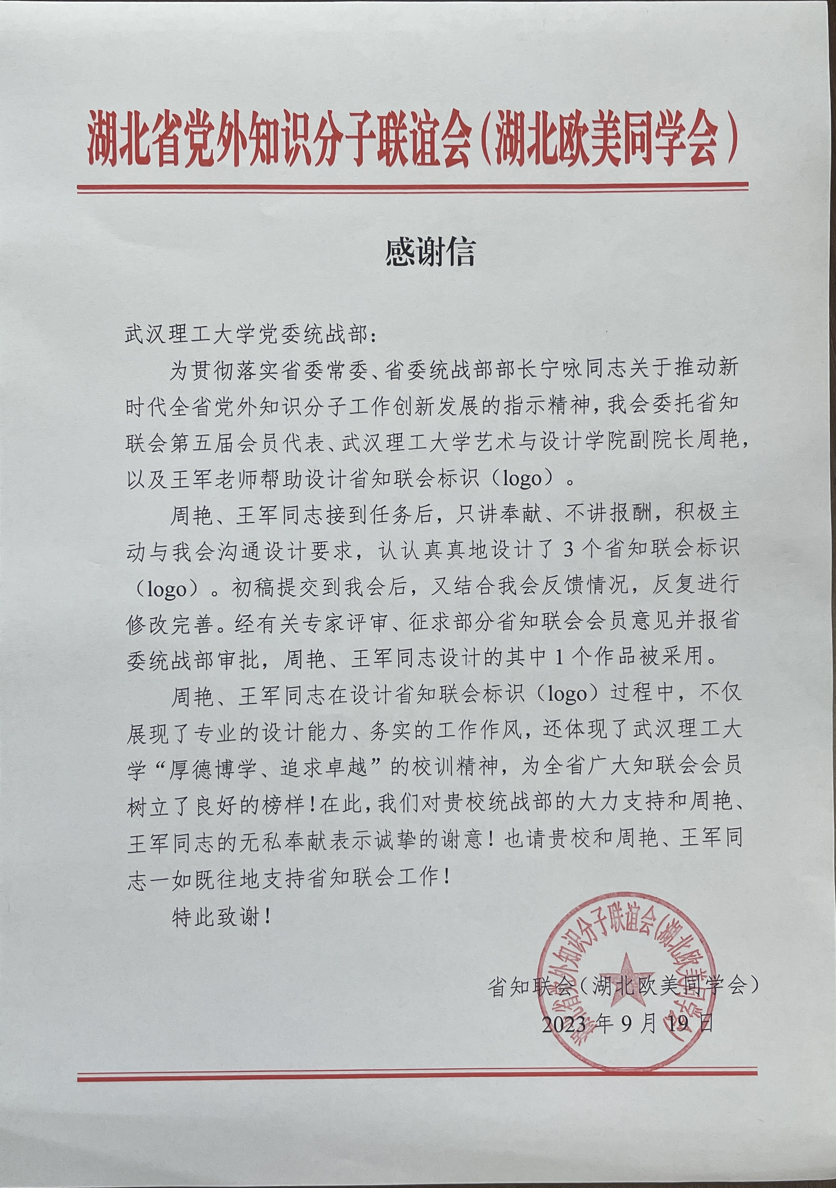 近日,湖北省党外知识分子联谊会(湖北欧美同学会)向我校党委统战部发来感谢信,对我校知联会理事、艺术与设计学院副院长周艳,以及王军老师帮助设计省知联会标识(logo)表示衷心感谢和高度评价。