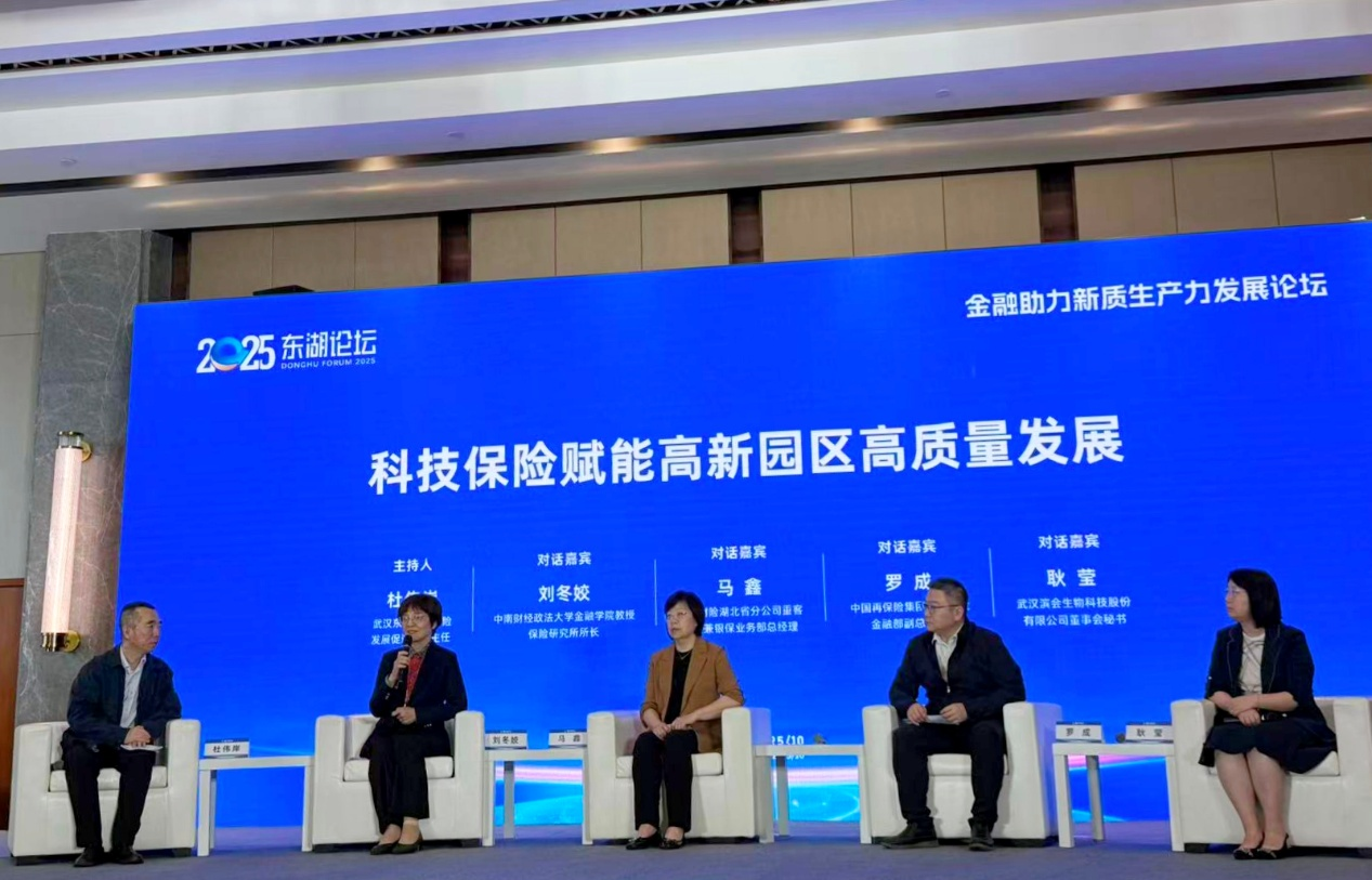 在以“科技保险赋能高新园区高质量发展”为主题的圆桌对话环节,主持人杜伟岸教授与中南财经政法大学金融学院教授刘冬姣、国寿财险湖北省分公司重客业务部负责人马鑫、中国再保险集团产险产业金融部副总经理罗成以及武汉滨会生物科技股份有限公司董事会秘书耿莹等嘉宾,共同探讨科技保险在服务园区创新、护航企业发展中的实践与挑战。